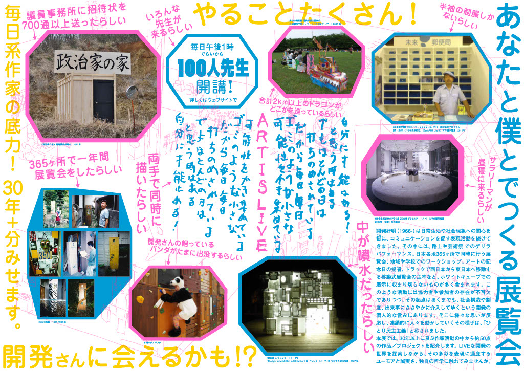 Kaihatsu’s gestures of personally intervening in social structures, systems, communities, and events have come to characterize his practice: the late Osamu Ikeda (former director of BankART1929) called it “One Person Democracy*.” “Democracy,” a term premised on everyone’s participation, may seem to contradict “one person.” However, precisely because these movements are not united, individuals can react to each other, and the reaction successively involves people and results in an action. This is where we find the core of Kaihatsu’s artistic expression.
