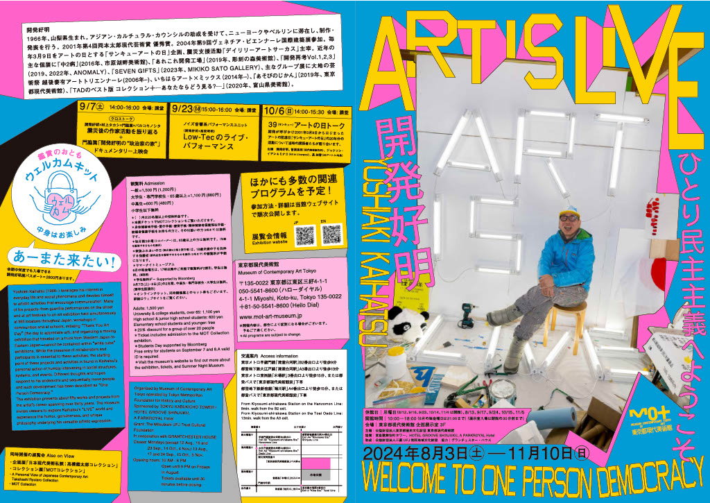 Museum of Contemporary Art Tokyo is pleased to present Yoshiaki Kaihatsu: ART IS LIVE―Welcome to One Person Democracy, the first major exhibition dedicated to Yoshiaki Kaihatsu (1966–) held at a museum in Tokyo. Since the beginning of his career in the 1990s, the artist has devoted himself to artistic activities that involve and provoke communication, with underlying interest in familiar events, such as everyday life and social occurrences.